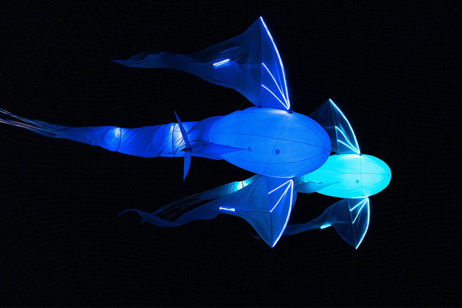 Un souffle de poésie enchante dans la nuit. Les Luminéoles, oiseaux imaginaires aux ailes graciles, dansent avec le vent dans leurs habits de lumière. Délicatement, les Amours en cages, étoiles suspendues à la voûte céleste, immergent le spectateur dans cet univers merveilleux.